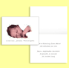 This 5 1/2" X 4 1/4" folded notecard displays your baby's printed photo and special message inside. May include a matching ribbon.